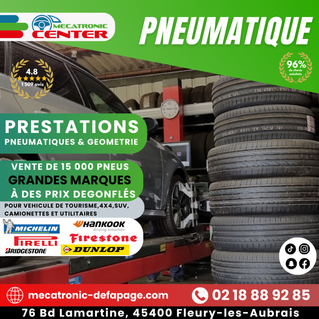 Pour plus d’informations sur nos services de montage, d’équilibrage et de géométrie de pneus à Saint Jean de la Ruelle, visitez notre site web Meca Tronic Center ou appelez-nous au 02 18 88 92 85. Notre équipe dévouée est prête à répondre à toutes vos questions et à vous fournir un service de qualité supérieure pour vos pneumatiques. Faites confiance à Meca Tronic Center pour prendre soin de vos pneus et assurer une conduite sûre et confortable à chaque trajet.